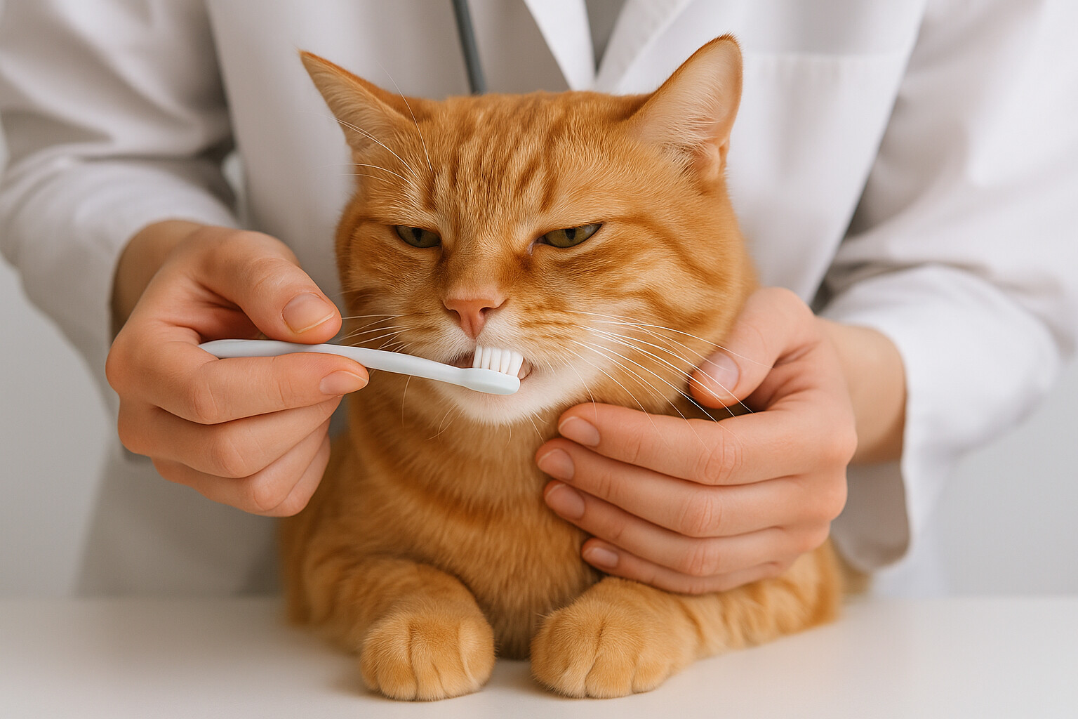 - A soft-bristled toothbrush designed for cats, or a finger brush that fits over your fingertip for easier control with resistant cats.